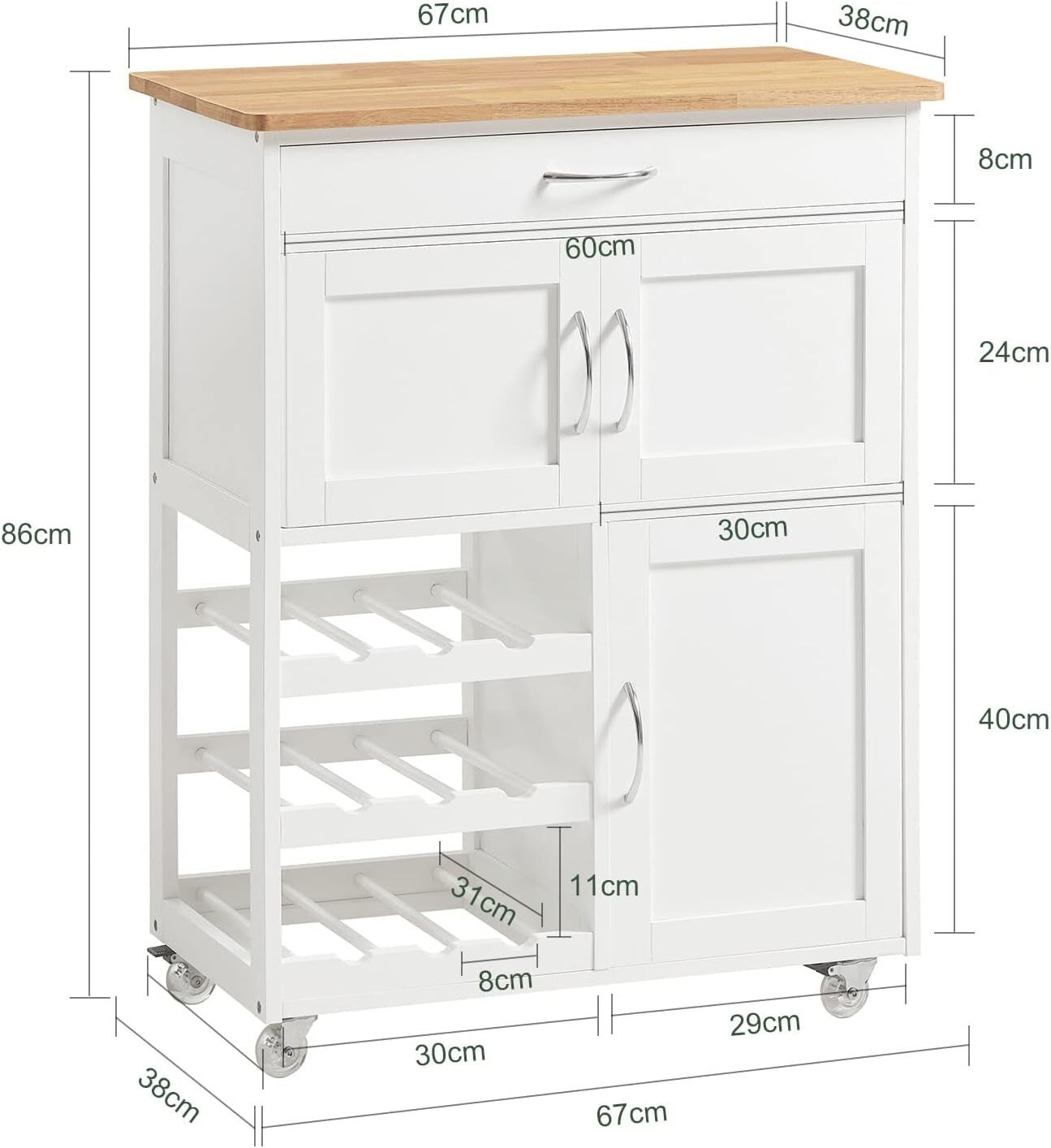 - Servierwagen mit Flaschenablagen und Schublade Küchenwagen Küchenschrank Rollwagen aus Kautschukholz, weiß-Natur BHT ca.: 67x86x38cm