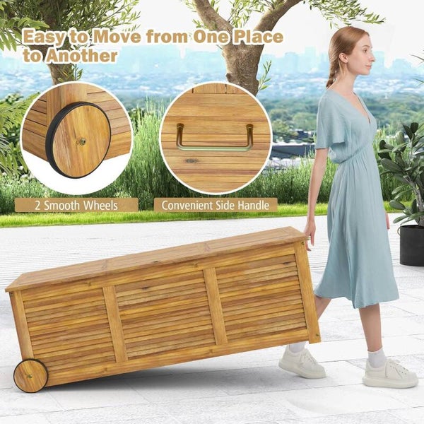 - Auflagenbox Kissenbox Akazien Holz 182L, Gartenbox Aufbewahrungsbox mit Rollen, Kissentruhe Gartentruhe mit Innentasche, Auflagentruhe Garten Holztruhe mit Griff, Gartenbank 127x50x45 cm